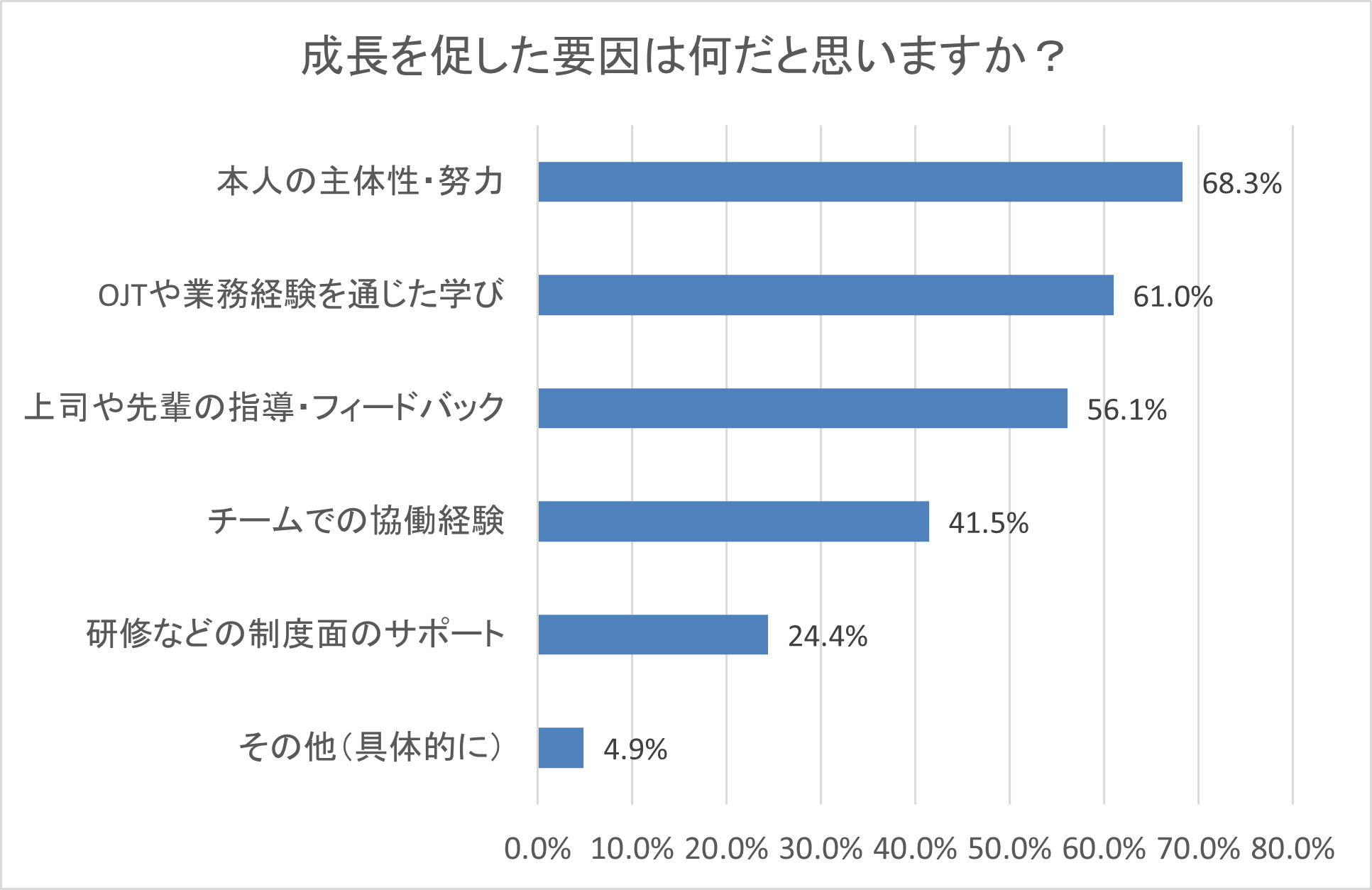 新卒社員の成長において最も大きな影響を与えたとされるのは、「本人の主体性・努力」(68.3%)でした。これは、受け身ではなく、自ら学び、挑戦しようとする姿勢が成長を大きく左右しているという、現場の実感が反映された結果といえます。