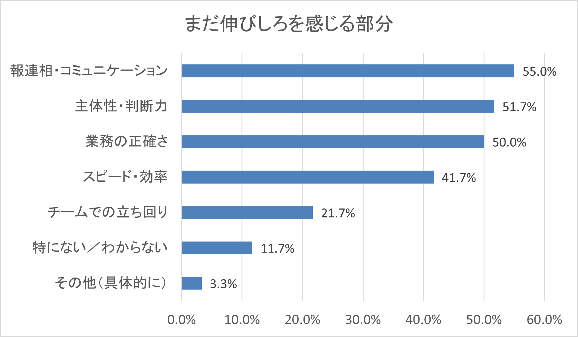 次いで「主体性・判断力」(51.7%)や「業務の正確さ」(50.0%)が半数を超え、多くの新卒社員がまだ指示待ち段階にあることがうかがえます。これは、新人から若手への移行段階において今後、改善が期待される領域です。
