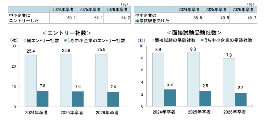 ○中小企業の面接試験を受けた学生は全体の49.7%。平均社数は2.2社。ともに前年より減少