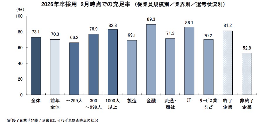 選考終了企業は71.5%。前年(68.4%)より増加。充足率もやや上昇(70.3%→73.1%)