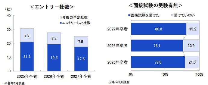 ○エントリー社数の平均は17.6社。前年同期より約2社減。面接経験者は早くも8割