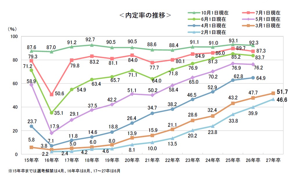 ○内定率は51.7%。広報解禁のタイミングで5割を上回るのは初めて