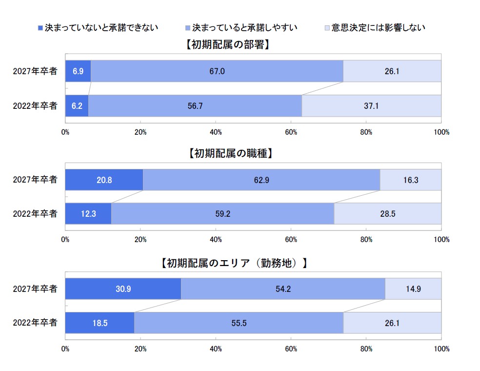 ○配属エリアが「決まっていないと内定を承諾できない」が3割超。5年前より大幅に増加