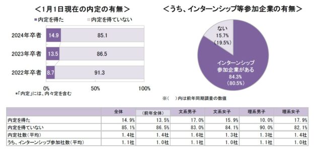 ○「内定を得た」14.9%。前年同期(13.5%)より1.4ポイント上昇